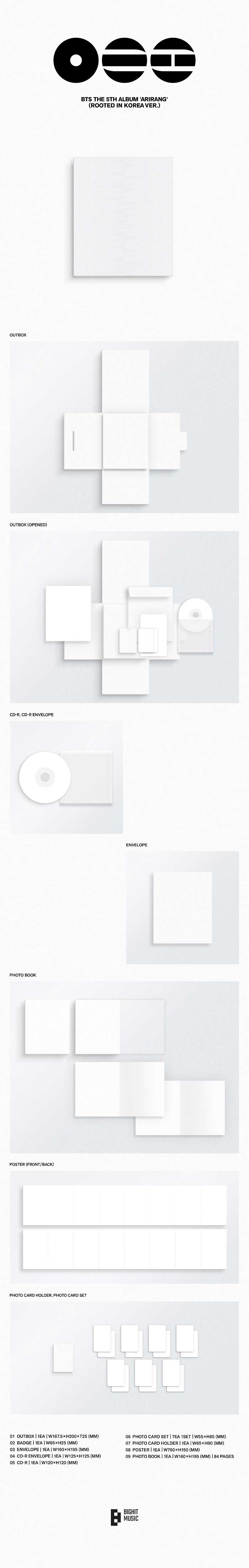 * Rooted in Korea Ver. : Outbox + CD + Photobook (84 P) + Badge + Envelope + Photocard (7 P) + Photocard Holder + Poster (On Pack)