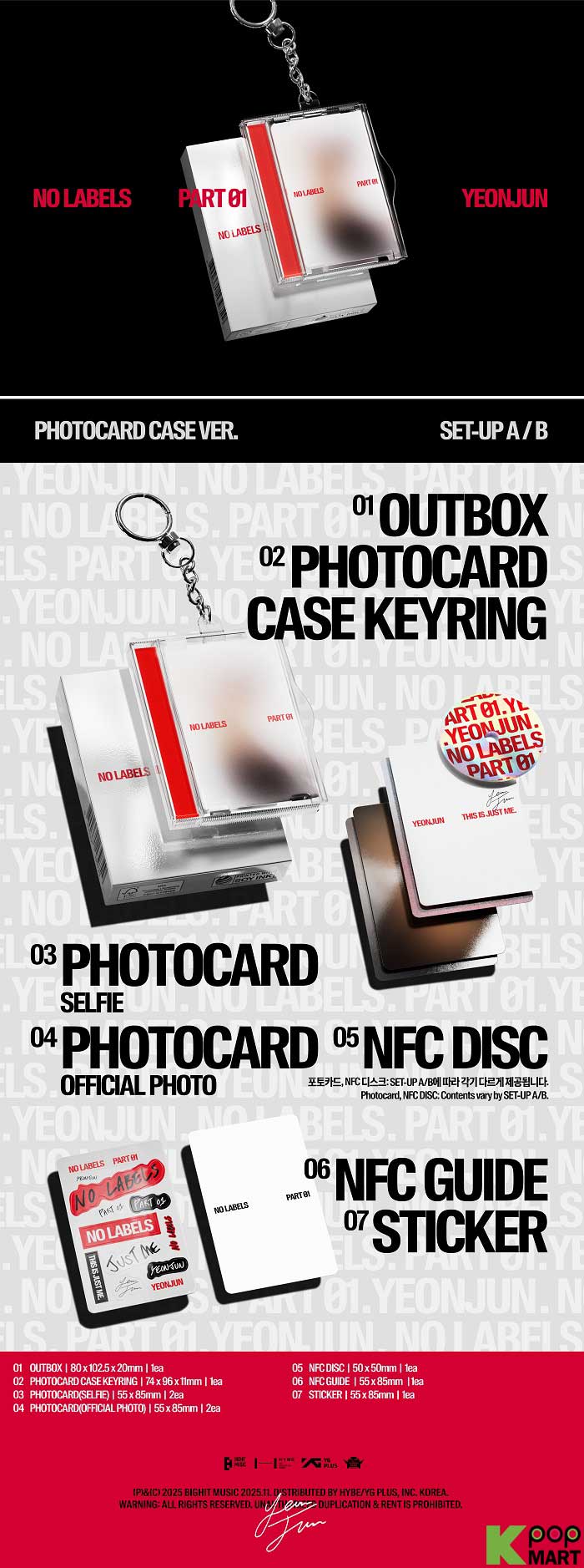 * Outbox + Photocard Case Keyring + Photocard (Selfie 2 P, Official 2 P) + NFC Disc + NFC Guide + Sticker